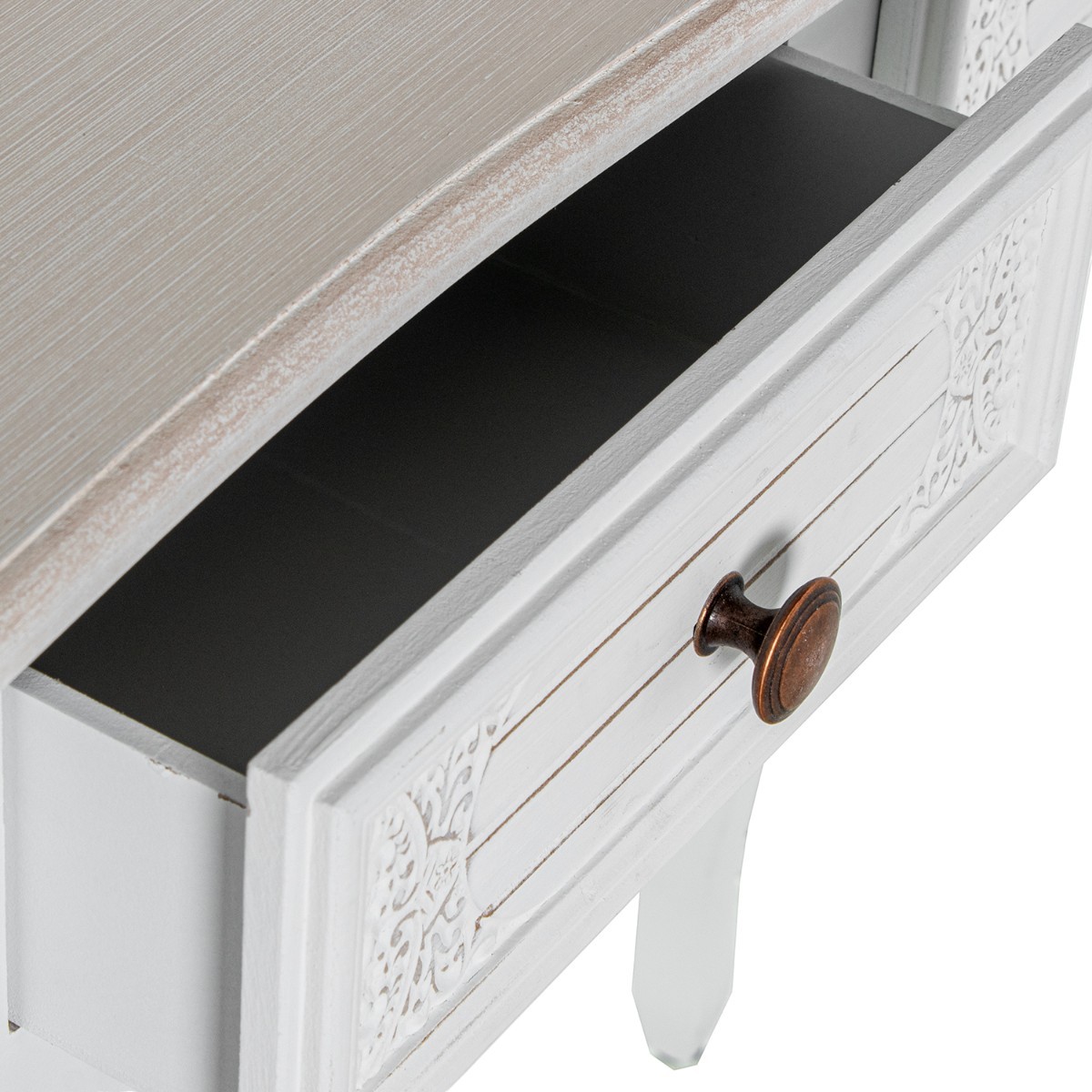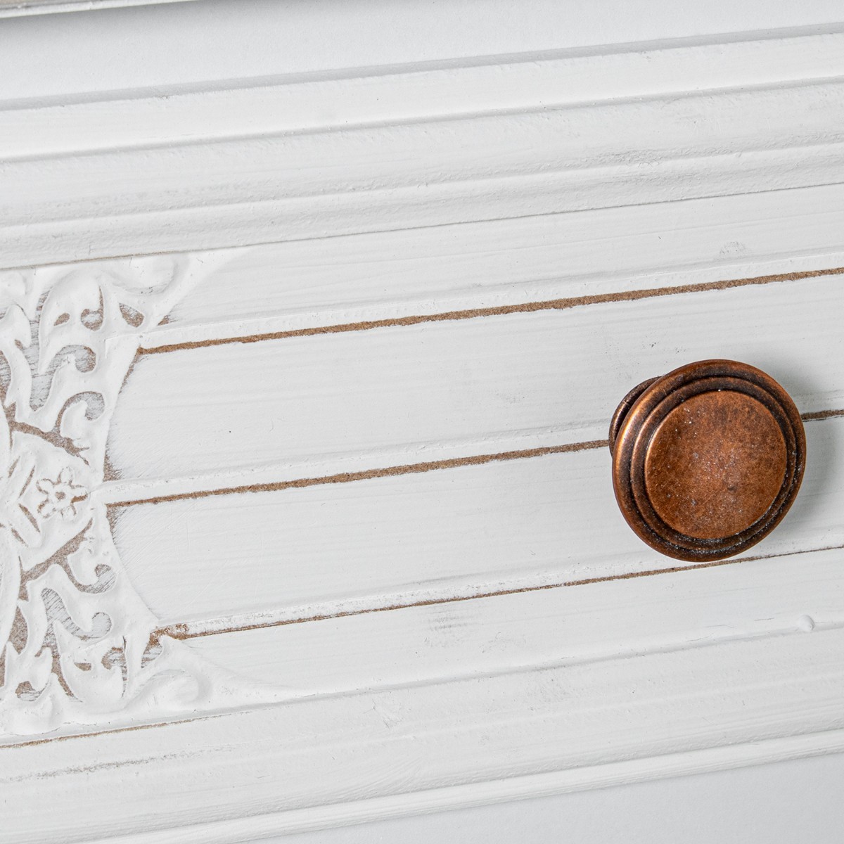 - Acabado en blanco decapado, elegante y luminoso.