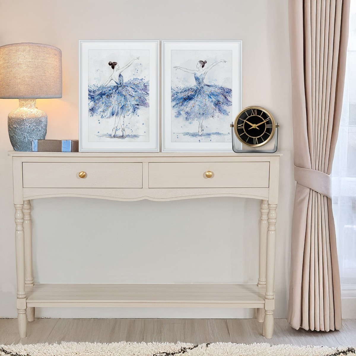 Visualmente, la Mesa Entrada 110cm presenta un diseño armonioso con un tablero rectanguloso y esquinas redondeadas que aportan suavidad a su forma. Sus patas torneadas no solo añaden un elemento decorativo, sino que también garantizan estabilidad. Además, la mesa dispone de dos cajones con tiradores en tono dorado, que ofrecen un contraste atractivo y práctico para el almacenamiento de objetos pequeños. En la parte inferior, un estante adicional proporciona espacio extra para exhibir decoraciones o almacenar artículos.