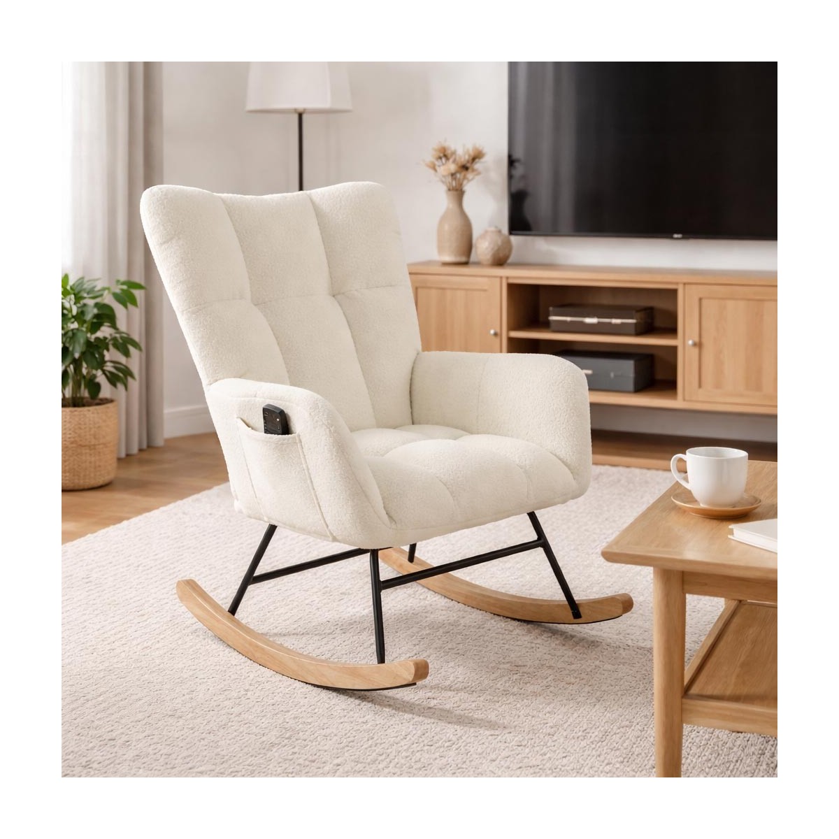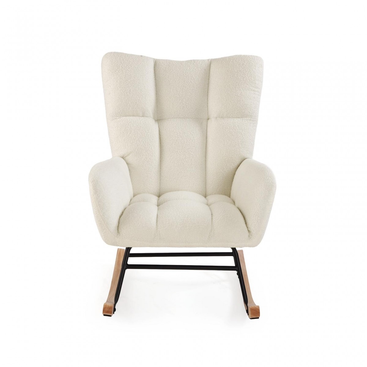 Visualmente, la mecedora DRAME destaca por su tapizado en poliéster de textura suave y acogedora, que no solo es agradable al tacto, sino que también añade un aire moderno a la estancia. El respaldo alto y los laterales amplios garantizan un soporte óptimo, mientras que los cojines, divididos en secciones acolchadas, ofrecen un confort inigualable. La base de madera presenta un acabado natural que contrasta armoniosamente con el metal negro de la estructura, creando un equilibrio atractivo.