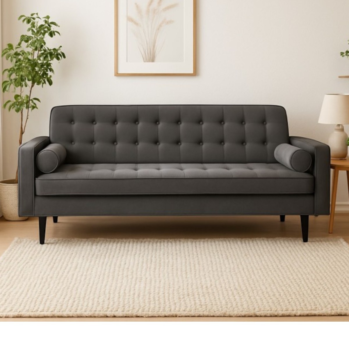 Visualmente, el sofá destaca por sus líneas limpias y su estructura bien definida. Cuenta con un respaldo ligeramente acolchado y botones decorativos que añaden un aire de distinción. Los brazos del sofá son robustos y están diseñados para mayor comodidad, mientras que los cojines de los laterales ofrecen un soporte adicional. Las patas, en un acabado oscuro, proporcionan estabilidad y un contraste elegante con la tela suave, creando un conjunto armonioso y atractivo.