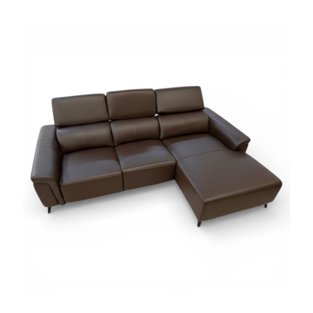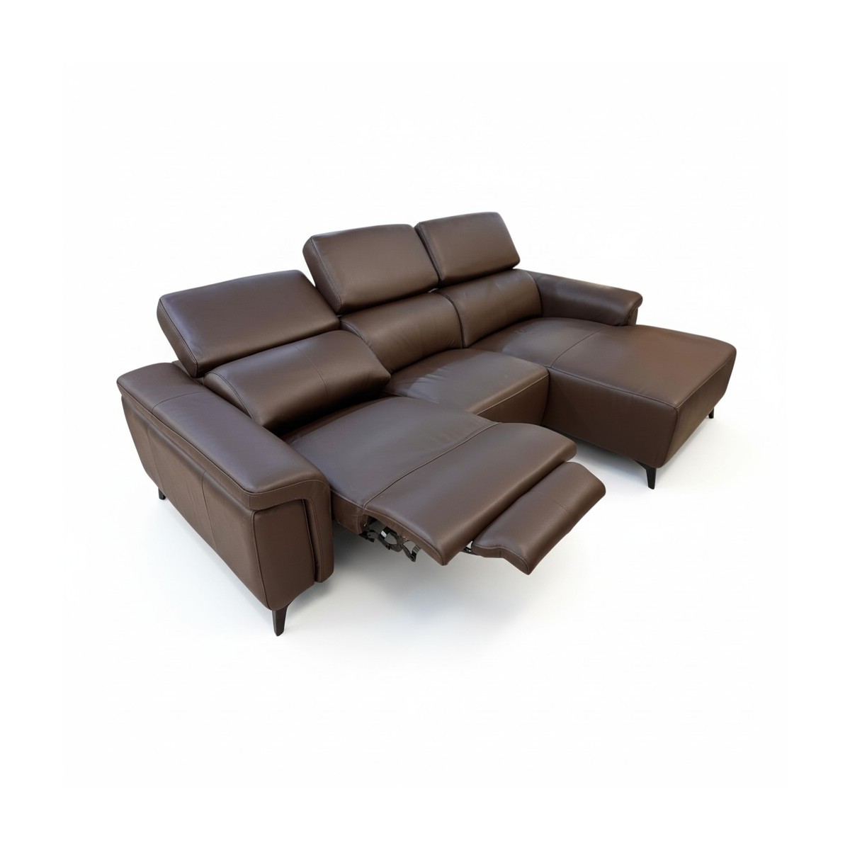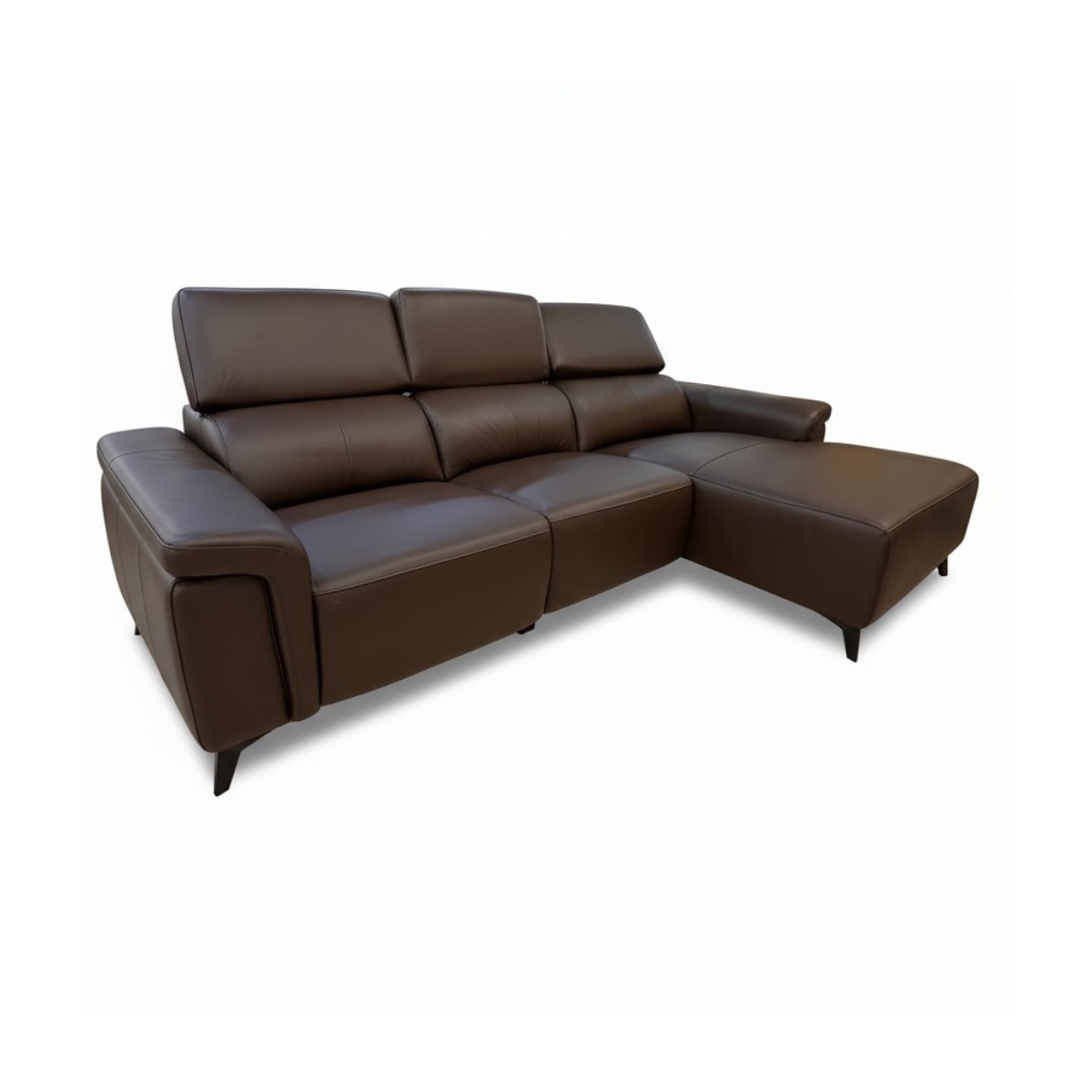 Visualmente, la chaise se caracteriza por sus líneas limpias y acabados de alta calidad. La piel de color chocolate presenta una textura suave y sedosa que invita al contacto, mientras que las costuras cuidadas resaltan la atención al detalle. Los reposabrazos y respaldos acolchados ofrecen un soporte adicional, haciendo que este mueble no solo sea atractivo, sino también extremadamente funcional. Con unas dimensiones generosas, la chaise es perfecta para reuniones familiares o para disfrutar de una tarde de cine en casa.